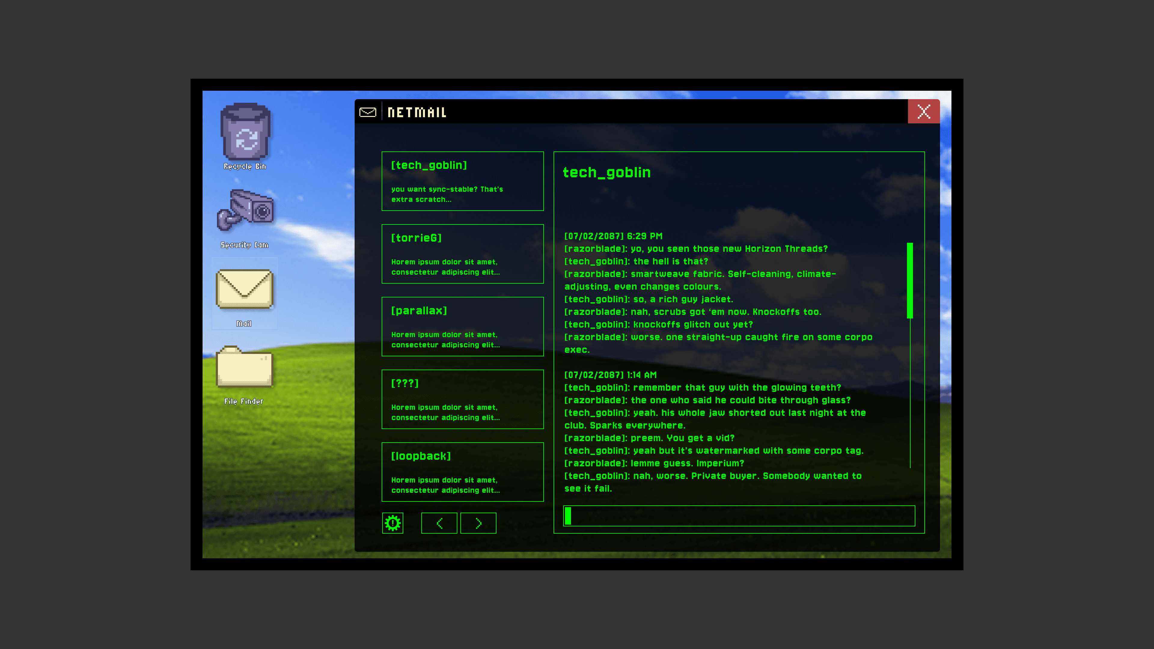 The core messaging and mail application featured in Blackwood, used to deliver narrative logs and conversations between characters. Since it handles large volumes of text, the layout prioritizes readability, spacing, and text hierarchy. Typography, message grouping, and container width were refined to ensure comfortable reading across long narrative exchanges.