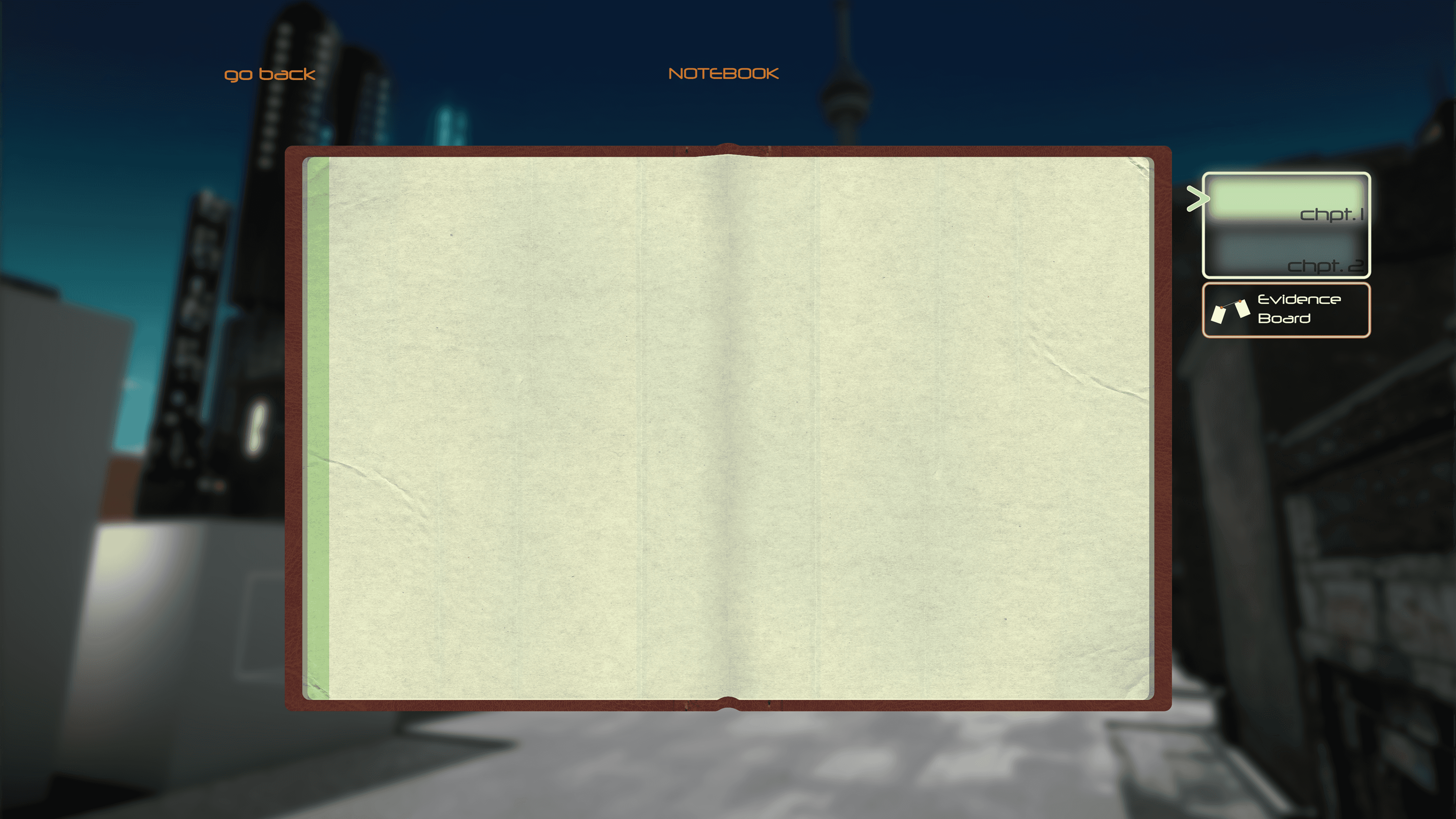 Cipher’s police notebook is a diegetic tool that records, in Cipher’s writing, various aspects of the game. Pressing the ‘J’ key or via the menu system, the notebook contains Cipher’s Log and tracks all Tasks, Clues, and lexia players find throughout the game. This is a visual representation of the player’s progress in the game that can be consulted when the player needs to reference previously received information.