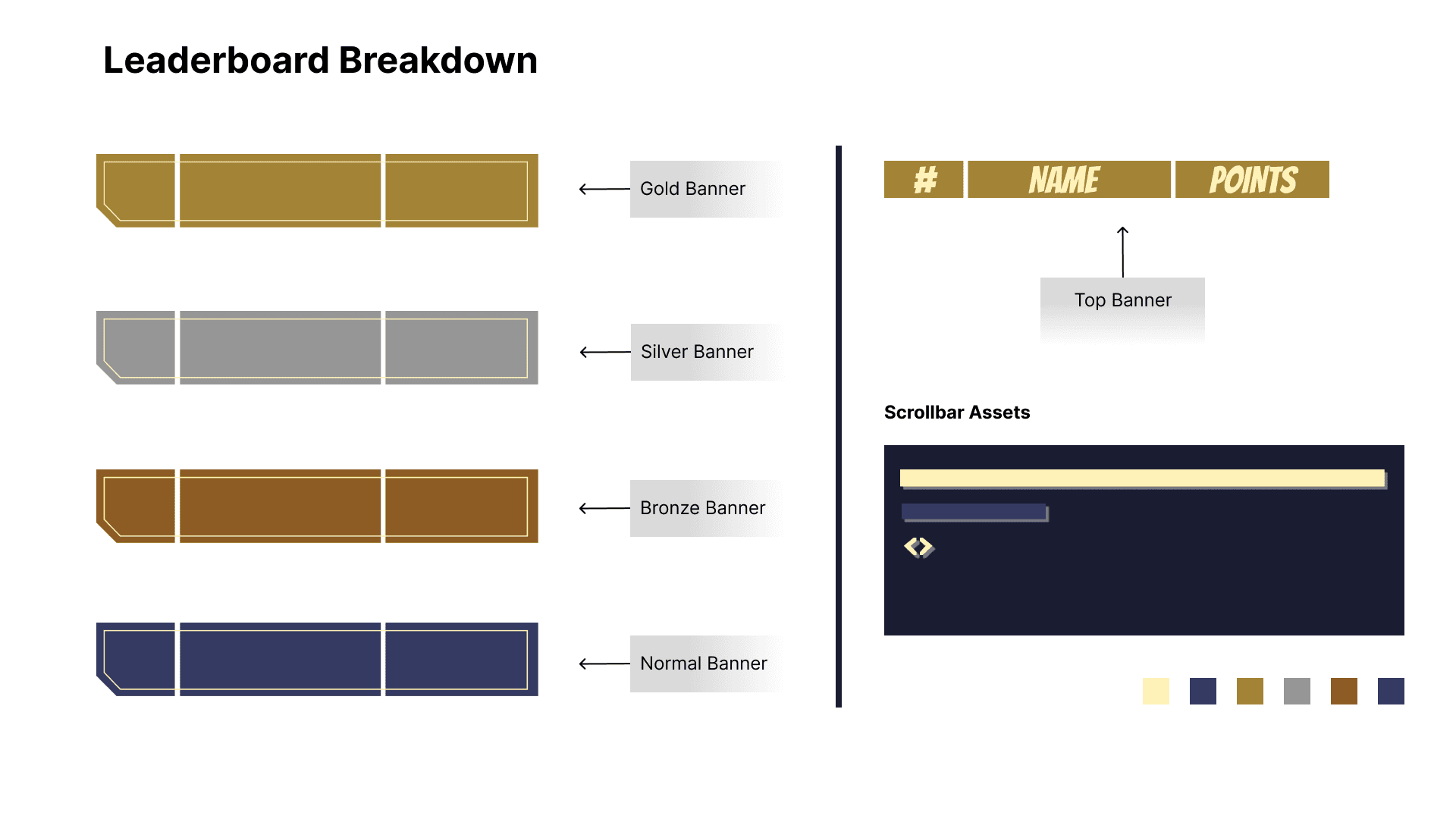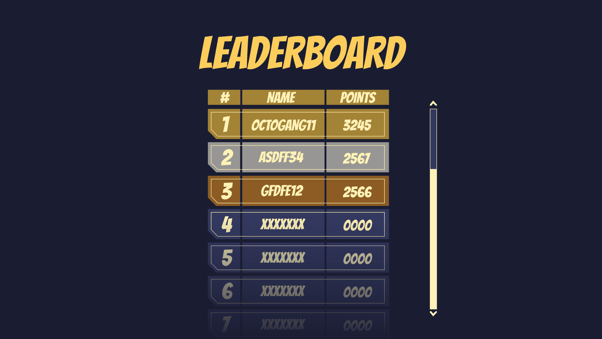 As mentioned, the leaderboard, found in the main menu, showcases the players that achieved the highest score in the game thus far, noting the top 3 players. Players can find the name, ranking, and number of points achieved. The leaderboard helps to foster the competitive and communal design goals of the game.