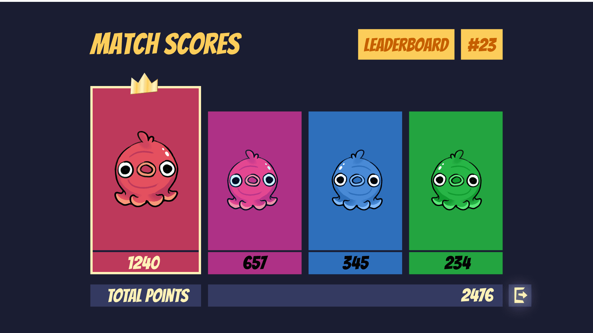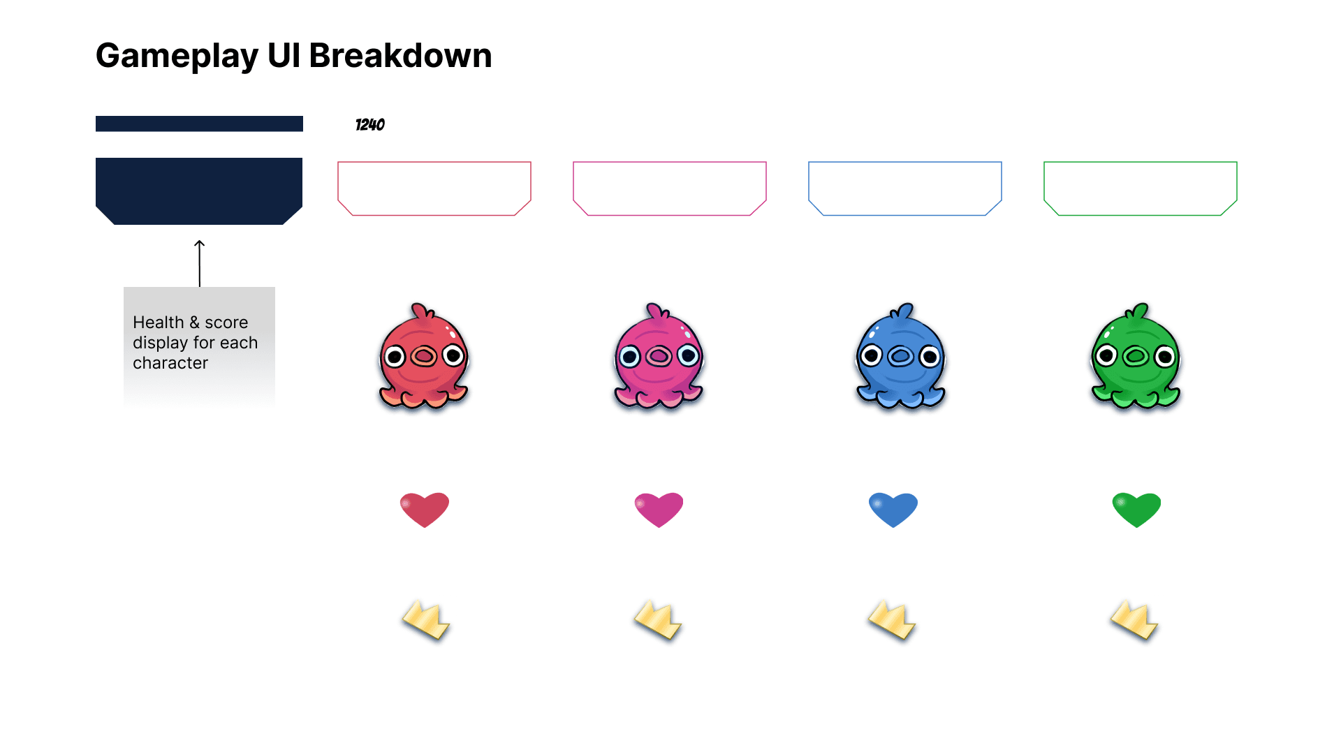 The frame and health colours will match the colours of the character. To denote which player has the most points, a crown will appear over their character in the HUD and in the gameplay.