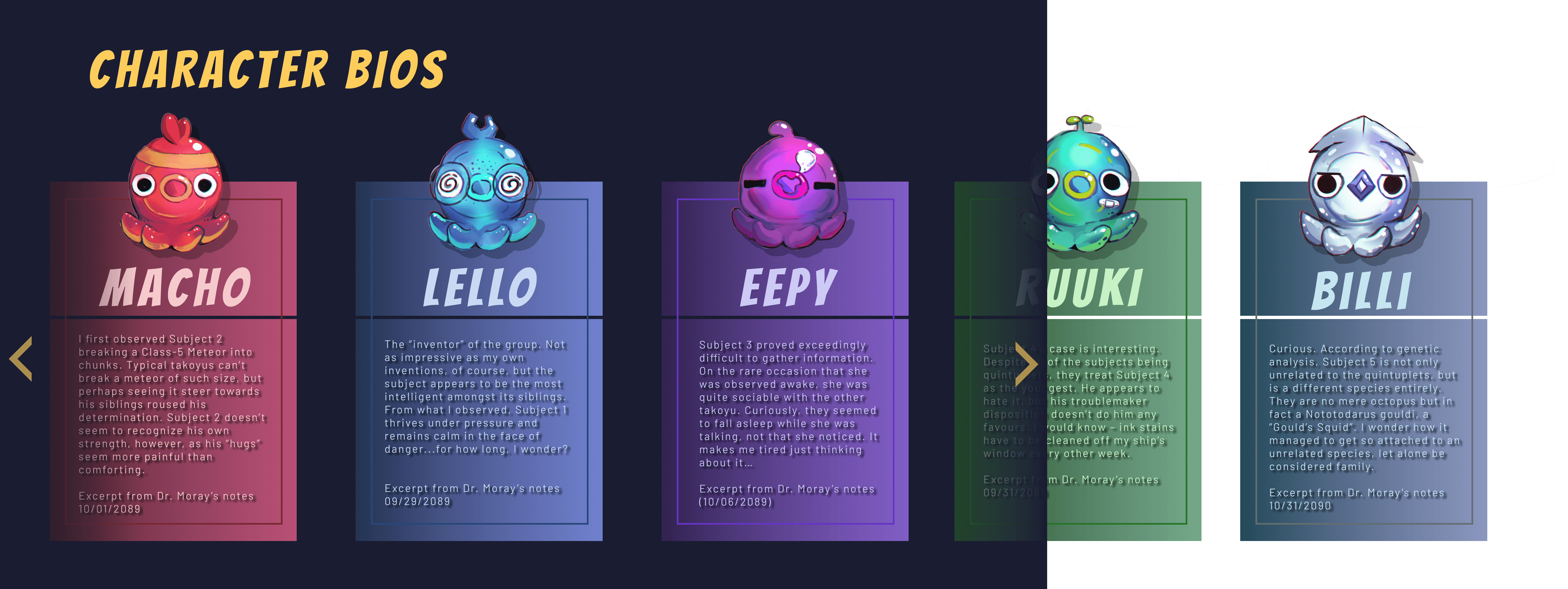The main menu appears before anything else in the game and features a range of sections the player can navigate through. In the top left corner, players can find the leaderboard, which showcases players with the highest score. Below that is the game's title and the randomized splash texts, which change each time you open the menu. In the bios section, players can scroll through short, diegetic lore entries that expand on the player characters. Players can also find the credits, which will open up to a visual credit roll.