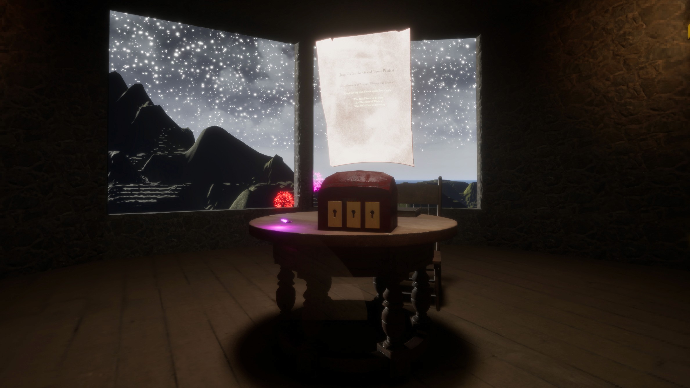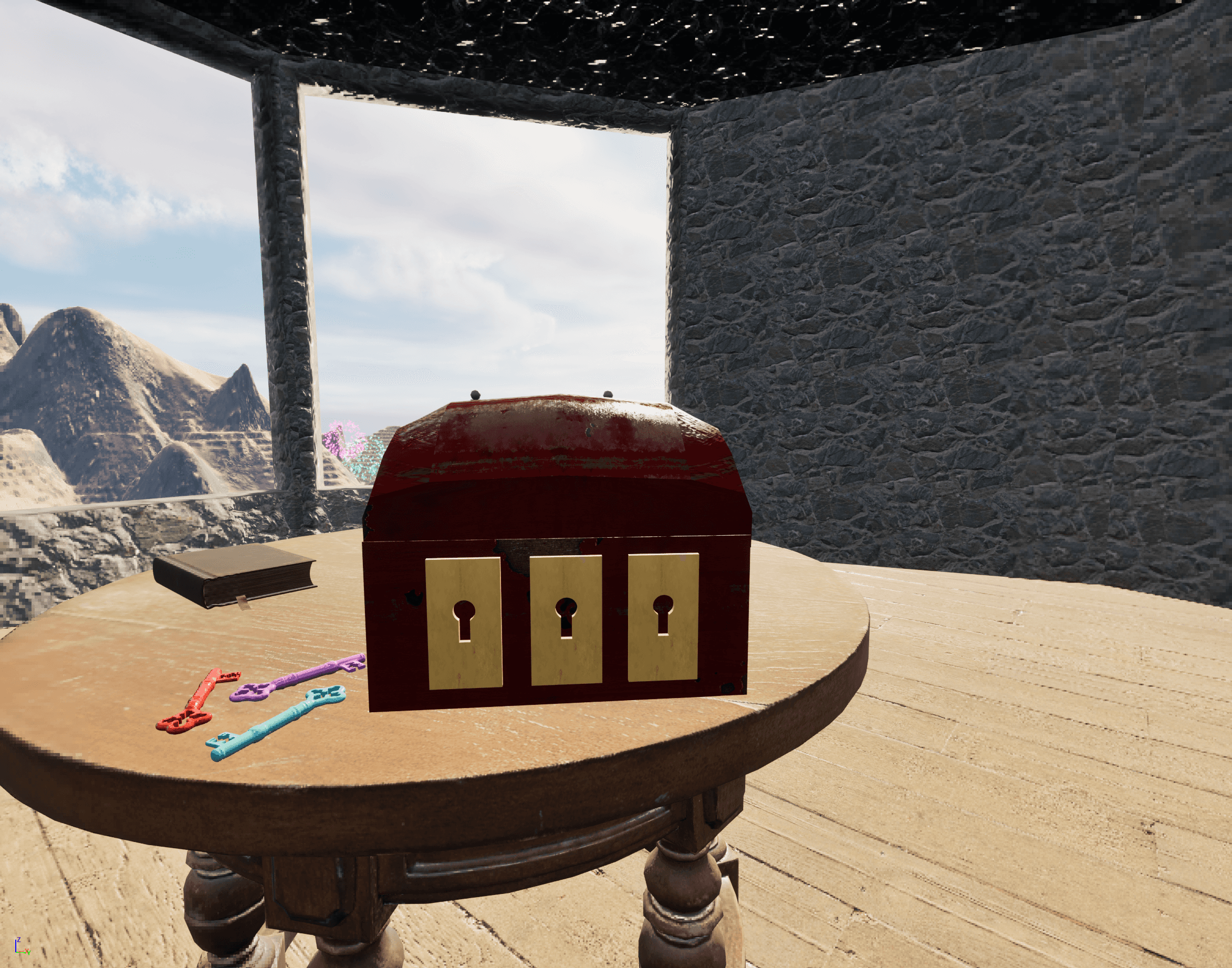 This puzzle features a chest with three keyholes that must be unlocked using colored keys placed in a specific sequence. The correct order is learned by observing the fireworks outside the tower window, creating a connection between environmental storytelling and player interaction. The mechanic reinforces memory, pattern recognition, and hands-on VR interaction while giving clear visual and audio feedback as each key is inserted.
